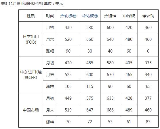 3、亞洲市場保持堅挺11月份,亞洲扁平材市場保持堅挺。中國國內鋼市場大幅飆升,蘭格云商監測數據顯示,11月份國內鋼材價格指數月環比猛烈飆升16.9%。綜合價格水平回升至3570元(人民幣,下同)水平,綜合價格水平比10月份上漲500元。板材價格水平由10月份的3260元猛升至3850元。得益于期貨價格和中國國內現貨價上漲的支撐,亞洲鋼材進口價格繼續上漲。與10月底相比,熱卷上漲63美元,冷卷漲約70美元,螺紋漲幅約63美元。賣方不愿降價,急于需求或補充庫存的買方不得不接受。由于價格上漲太快,部分鋼廠已暫停報價,而買家一時還來不及反應。一些急需或急于補庫的買家,不得不提高詢盤價格,一定程度上接受價格上漲。但也有部分買家表示,由于價格上漲太快,他們不敢下單,而是采取觀望。在韓國,繼10月份以后,浦項再次上調11月熱卷國內價格2萬韓元。在阿聯酋,阿聯酋扁平材進口市場持續上漲,月底中國熱卷報價在480-495美元(CFR),日本報540-550美元(CFR)(詳見表3)。預計12月份亞洲扁平材市場繼續呈現上漲格局。